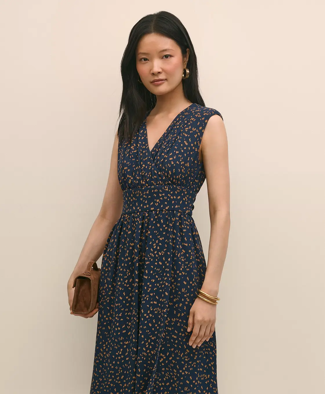 100% Viscose. Chiếc đầm được thiết kế từ 100% viscose, mang đến cảm giác mềm mại, rủ nhẹ tự nhiên và thoáng mát.
