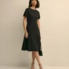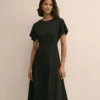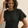97%Viscose 3%Spandex. Đầm nữ chất liệu pha viscose và spandex mềm mại và co giãn nhẹ. Thiết kế màu trơn thanh lịch, tay bèo tạo điểm nhấn nữ tính.