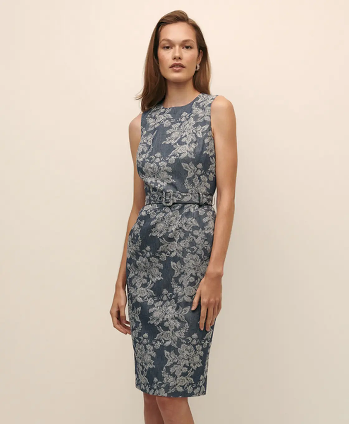 49%CO 27%PL 11%VI 9%. Chiếc đầm suông dáng ôm nổi bật với chất liệu jacquard hoa văn denim phủ toàn bộ, tạo cảm giác sang trọng nhưng vẫn gần gũi và hiện đại.