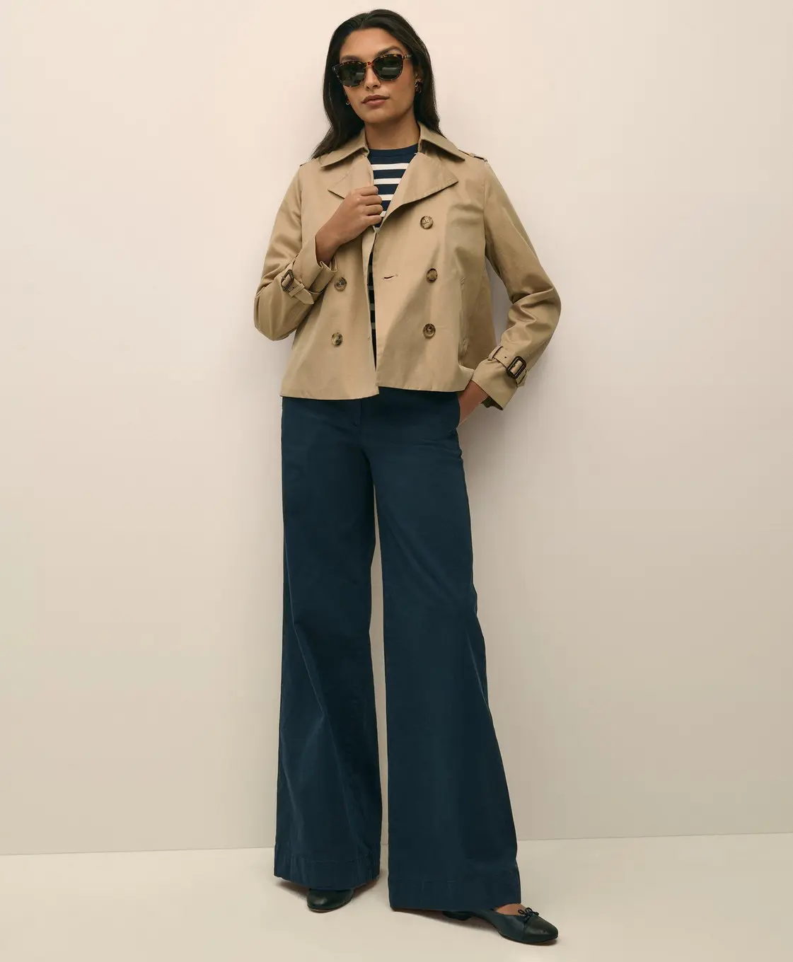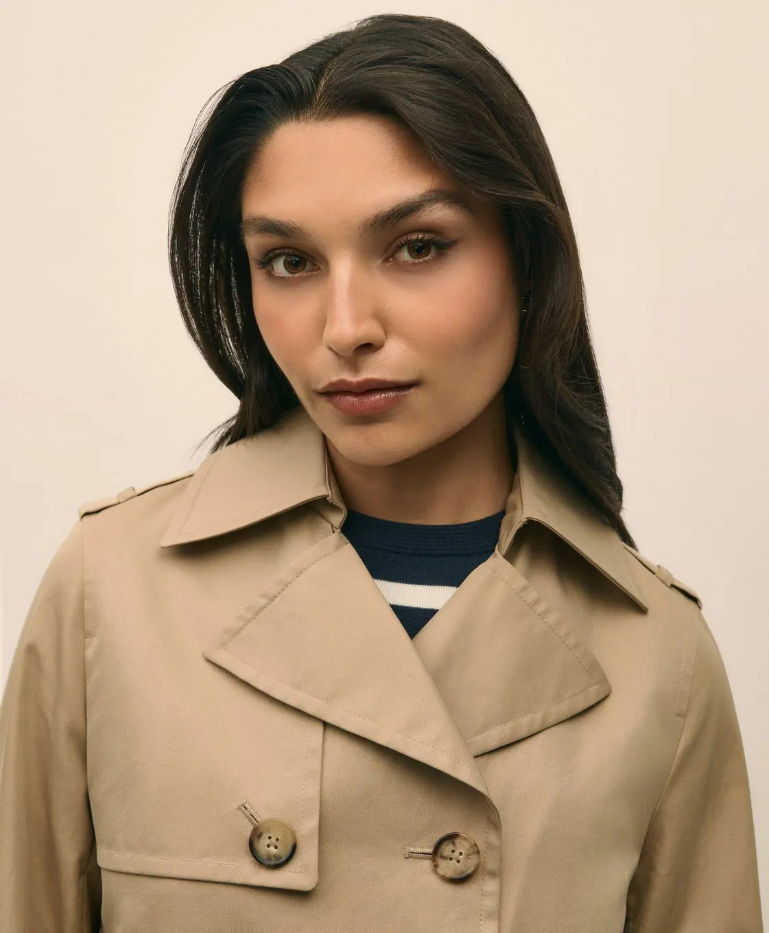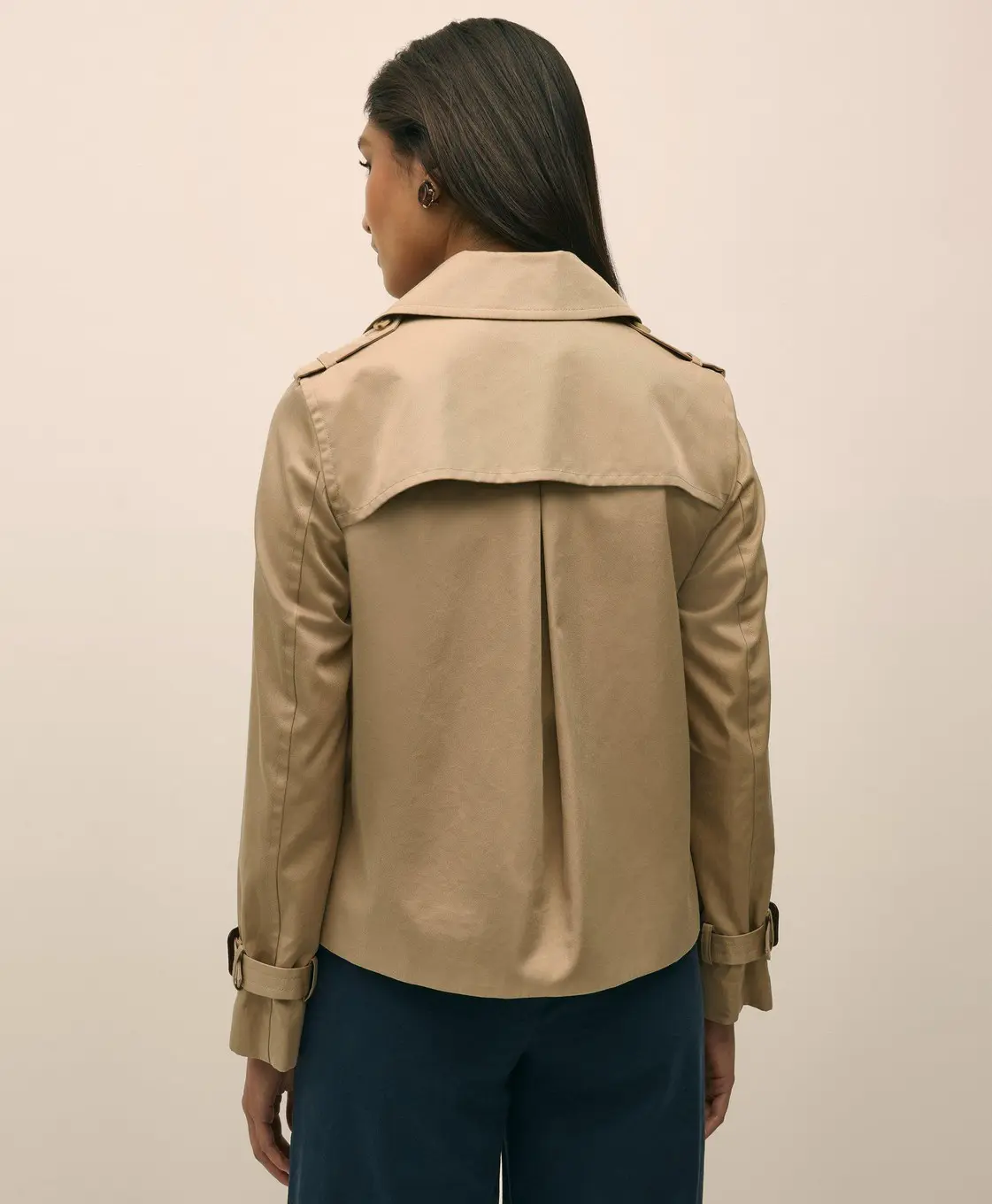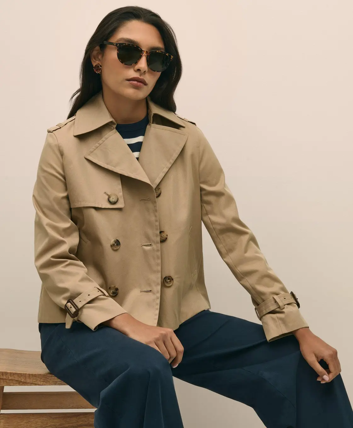 100% Cotton. Chiếc trench coat dáng lửng này được làm từ vải Supima Cotton Twill chống thấm nước, mang lại cảm giác mềm mại và bền bỉ.
