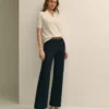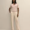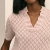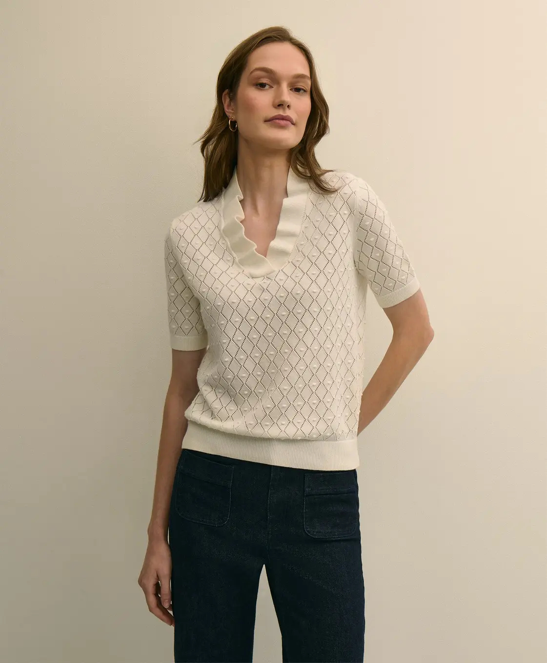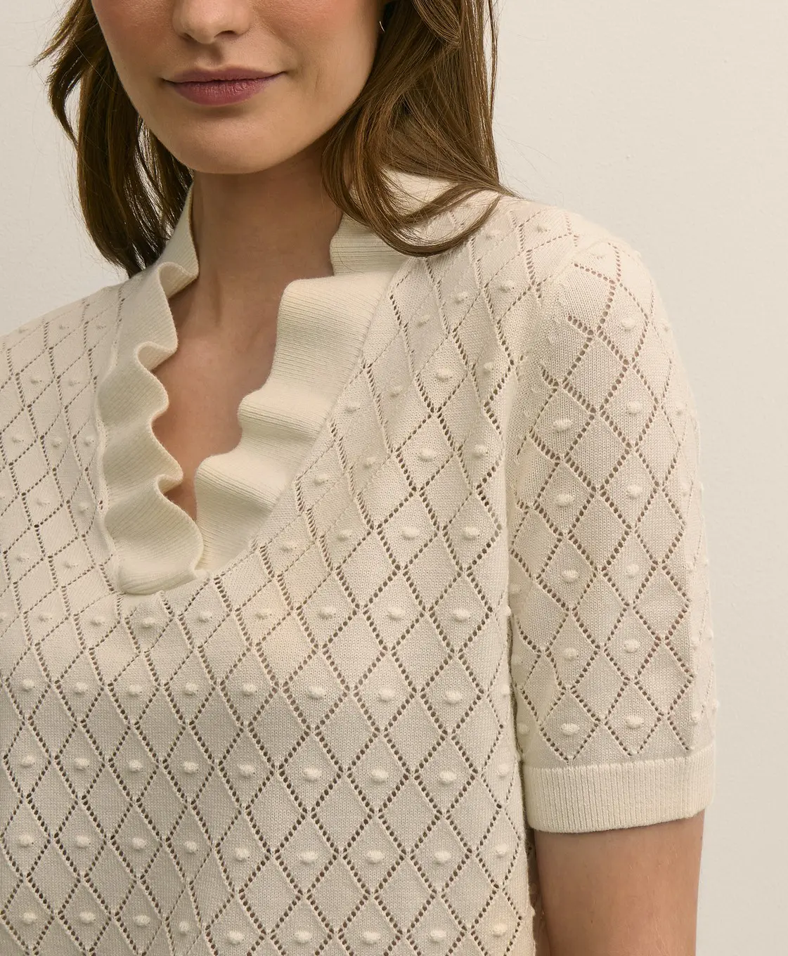 60%Cotton 40%Viscose. Áo len nữ tay ngắn, chất liệu cotton pha viscose mềm mại và thoáng nhẹ. Thiết kế cổ bèo nữ tính chạy dọc theo đường cổ V, tạo điểm nhấn mềm mại.