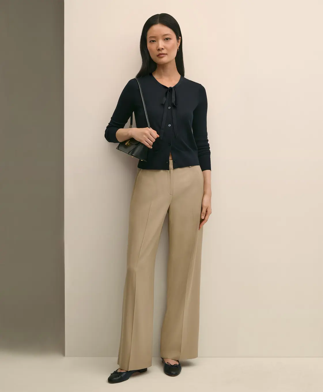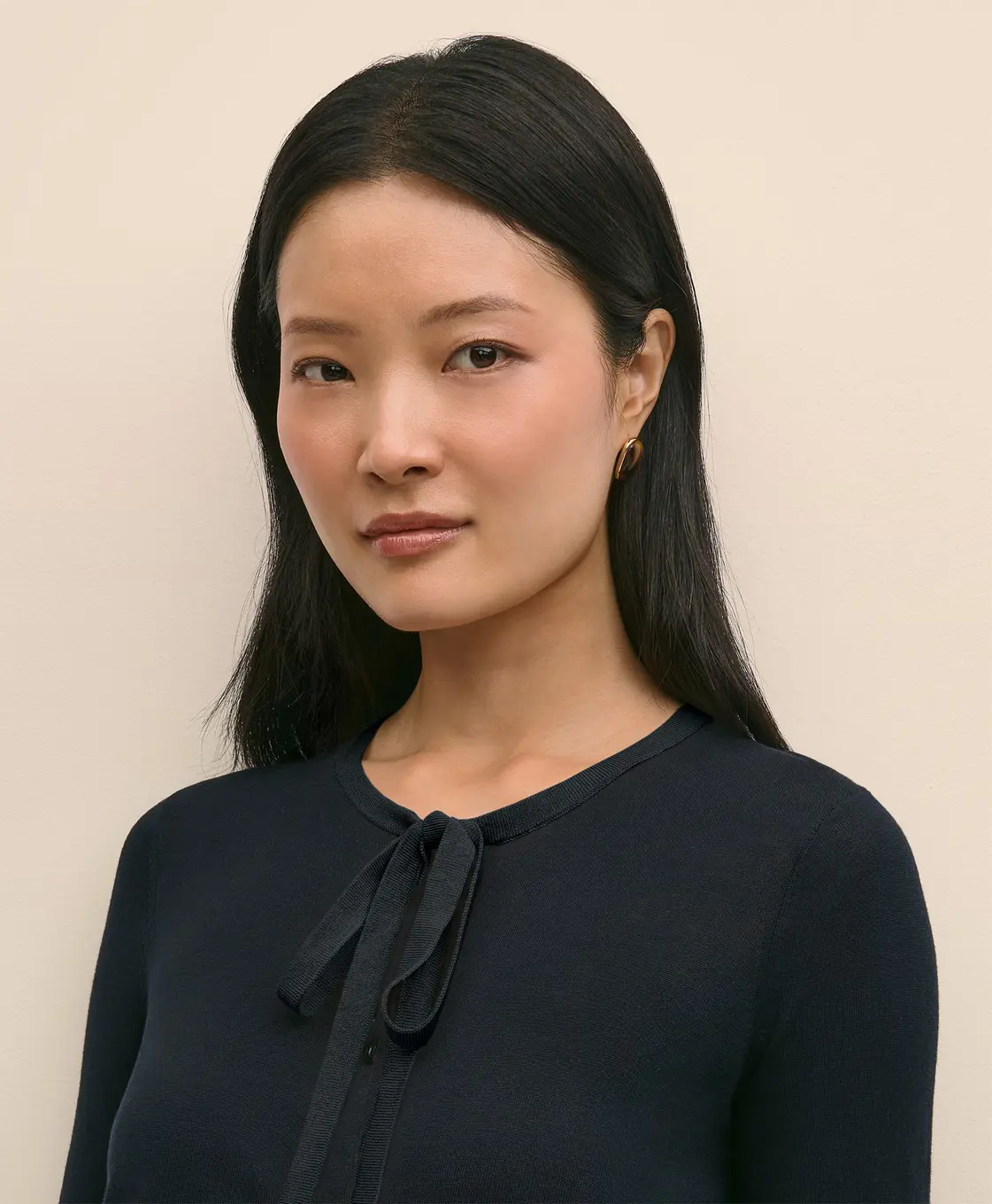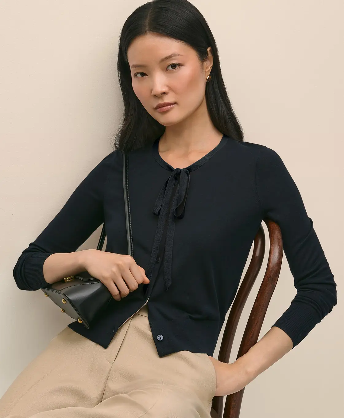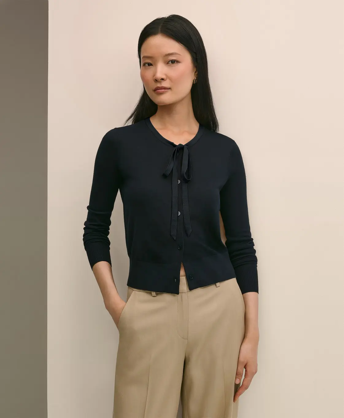 Chiếc cardigan thời trang mang phong cách nữ tính nhờ chi tiết nơ cột duyên dáng ở cổ áo. Thiết kế tay dài, chất liệu phối hợp 55% silk và 45% viscose, tạo cảm giác mềm mại, mượt mà và sang trọng.