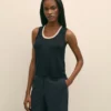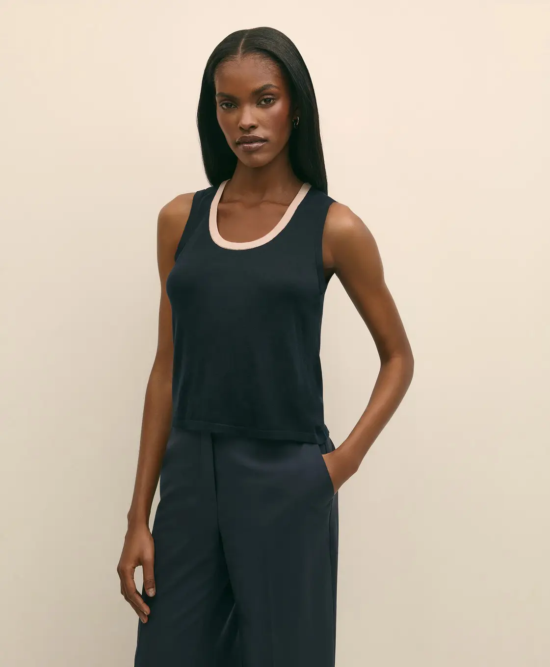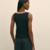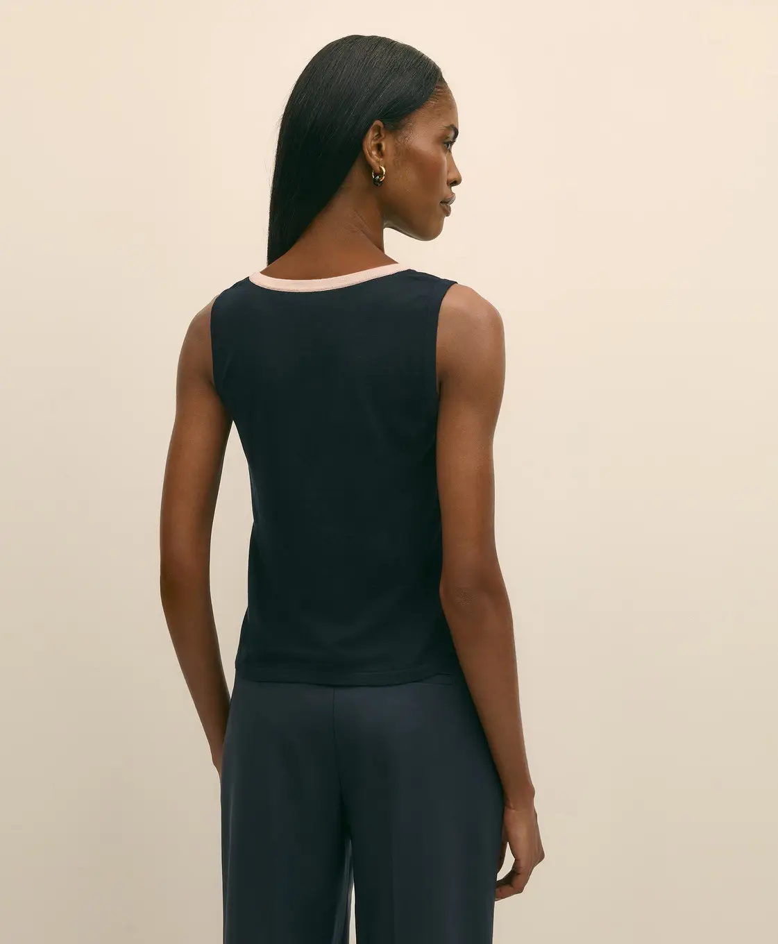 Áo không tay được làm từ chất liệu cao cấp gồm 55% lụa và 45% viscose, mang đến độ mềm mại và rủ tự nhiên với bề mặt mịn màng.